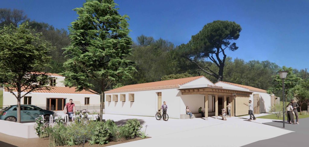 Au cœur des enjeux contemporains, ce projet démonstrateur, conçu pour atteindre le label Bâtiment Durable Méditerranéen, est réalisé en matériaux locaux et durables (mur à ossature bois avec isolation en botte de paille, toiture en tuile canal), et offre une qualité de vie optimale grâce à un plan fonctionnel, une centralisation des espaces pédagogiques et à un lien direct avec son environnement. Il est pensé comme un lieu de transmission, faisant lien et a ainsi pour ambition de s’insérer harmonieusement dans son contexte.