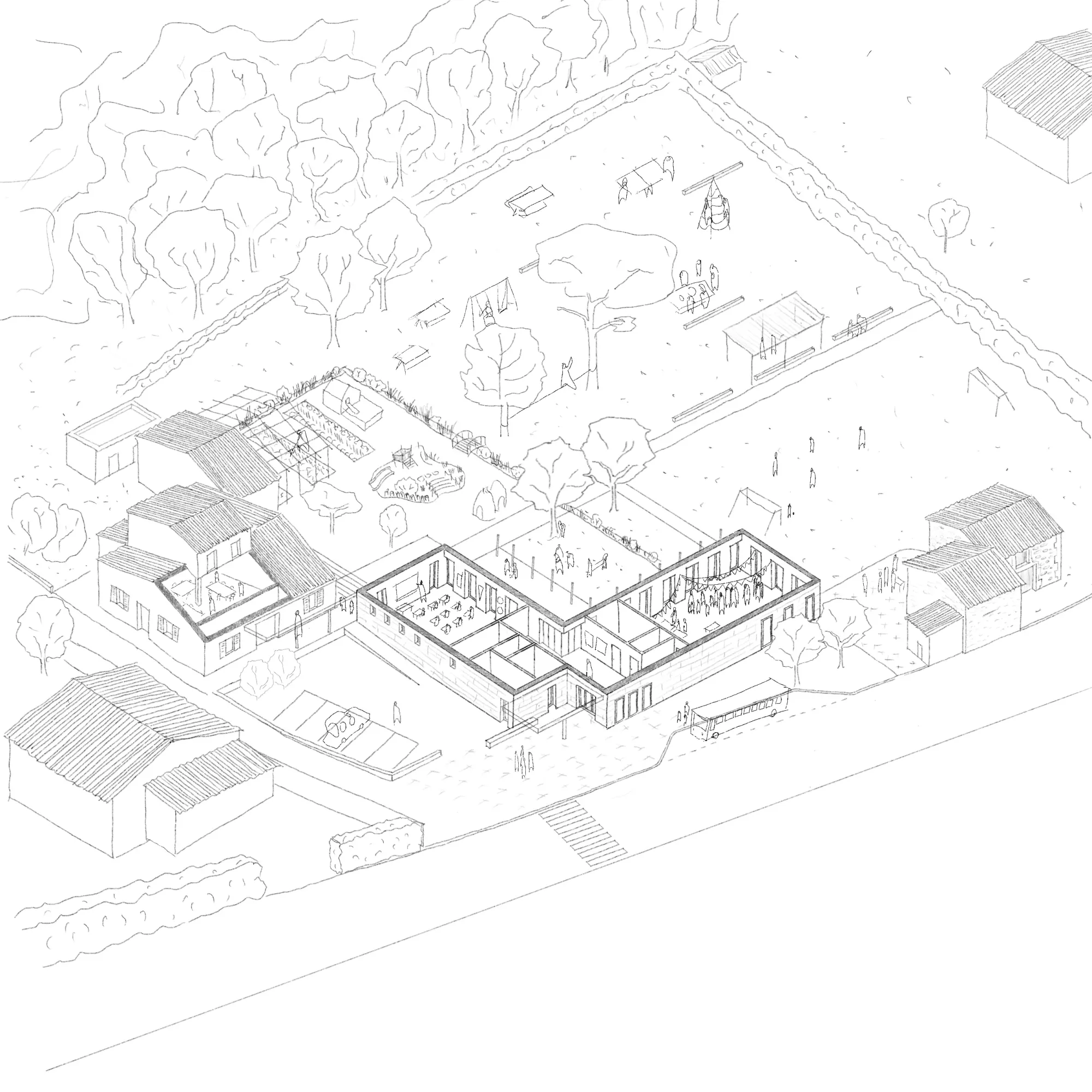 École primaire qui répond aux besoins actuels de ses usagers : effectifs grandissants, nécessité de faciliter l’accessibilité du site pour les communes voisines, volonté de créer un espace repère, vivant et citoyen sur le territoire, souhait d’occuper un bâtiment performant (thermique, ventilation, matérialités…) et de disposer d’espaces extérieurs adaptés pour les enfants.
